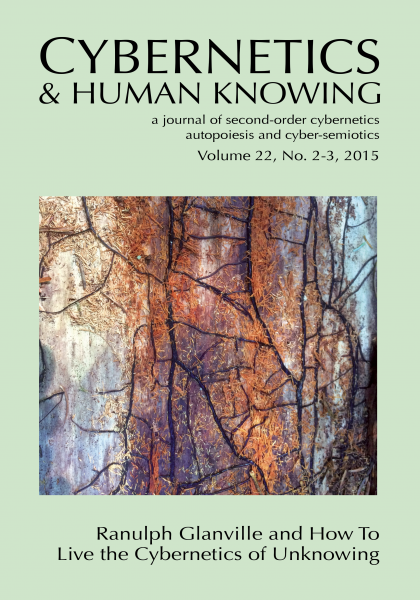 AllVolume 22Issue: 2-3Year: 2015Foreword: Ranulph Glanville & How to Live the Cybernetics of KnowingArticles: Living Between Cybernetics ColumnsRanulph Glanville: The Cybernetician of the Black Box of Second-order UnknowingRemembering Ranulph GlanvilleRanulph Glanville’s Thesis on the Theory of Objects and the Invention of Second-order CyberneticsDe Profundis: Ranulph Glanville’s Transcendental Framework for Second-order CyberneticsPutting Flesh on the Bones: Ranulph Glanville’s Contributions to Conversation TheoryCybernetics and Design: Conversations for ActionDesigning Exploring as a Second-order Process: A Legacy of Ranulph GlanvillePreferences in Architectural ResearchConversation, Design and Ethics: The Cybernetics of Ranulph GlanvilleThe Big Picture: Connecting Design, Second-order Cybernetics and Radical ConstructivismWhat I Learned from Ranulph GlanvilleWhat I Learned from Ranulph: A Grateful Tribute to Ranulph GlanvilleDesigning TogetherGlanville’s ConsistencyMy Time with Ranulph GlanvilleColumn: Virtual Logic—Laws of Form and the Mobius BandASC Pages: Second-Order Cybernetics, Radical Constructivism, and the Biology of Cognition: Paradigms Struggling to Bring About ChangeBook Review: Two Roads Which DivergedThe Noninevitable TeleologistPoems: Bonding is a heart conversationTemporal ArchitectureBeauty arisesThree FallsFeatured Artist: Pille Bunnell